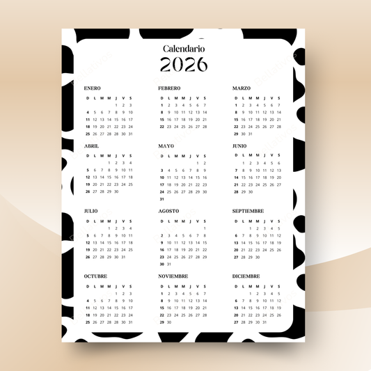 Calendario 2026 Blanco y Negro PDF Imprimible
