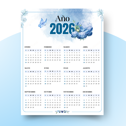 Calendario 2026 Azul Acuarela PDF Imprimible